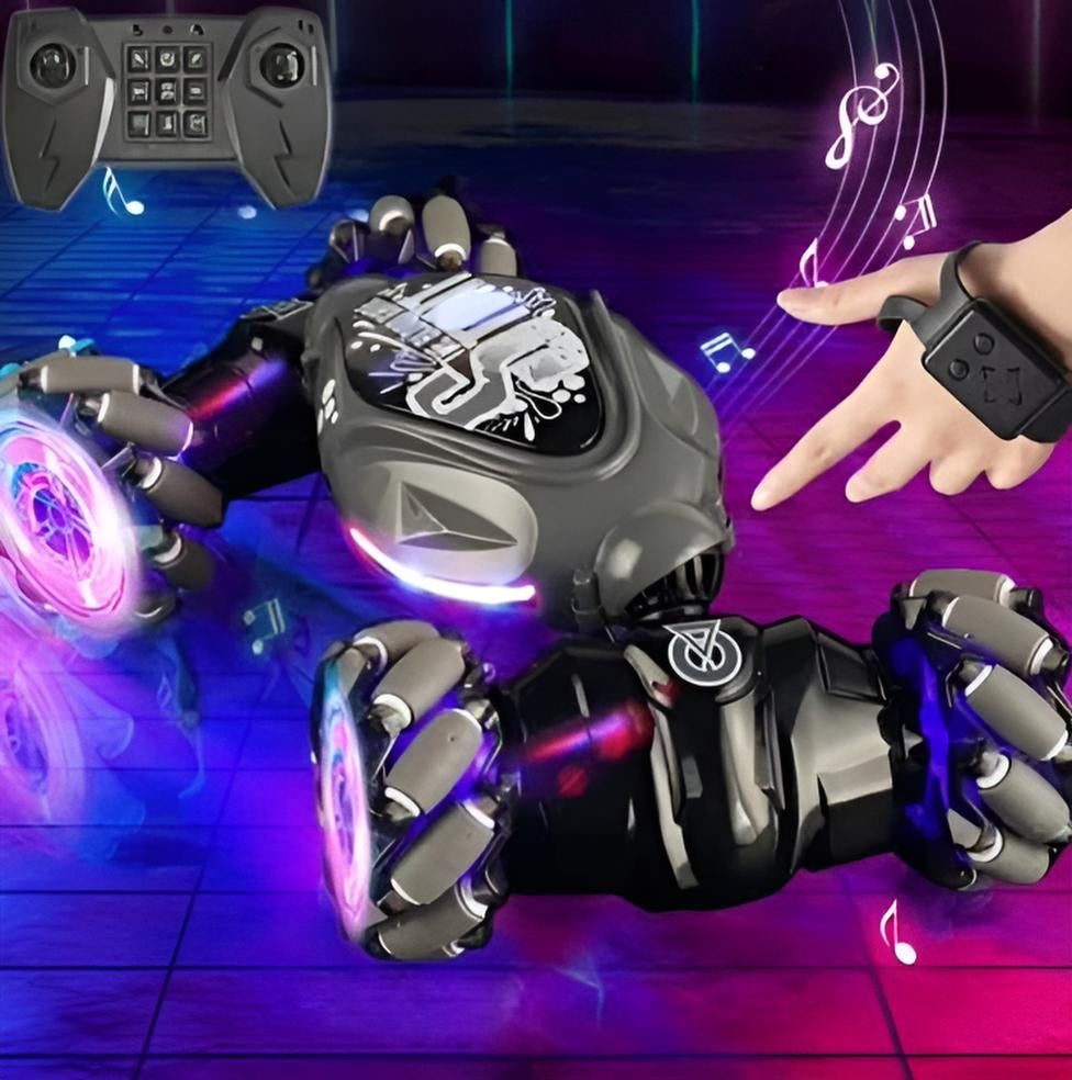 A criança controla tudo apenas com a mão. O sensor colocado no pulso reage imediatamente aos movimentos no ar – levantar a mão, rodar o pulso ou fazer um gesto mais marcado faz o carrinho acelerar, virar, rodar ou mudar de direção sem apertar nenhum botão. Para as crianças, parece uma superpoder real: o carrinho obedece a cada movimento como se fosse magia pura.